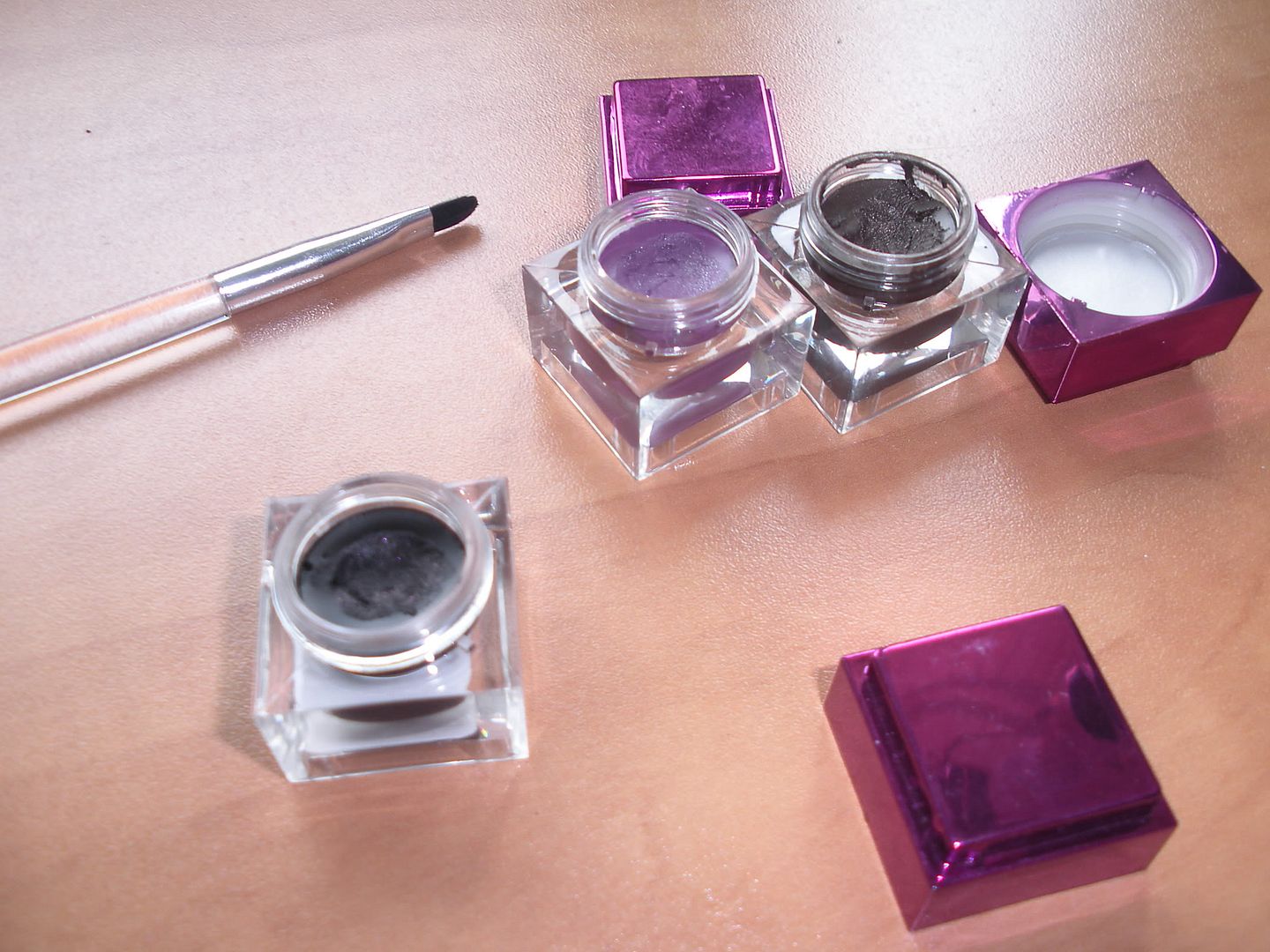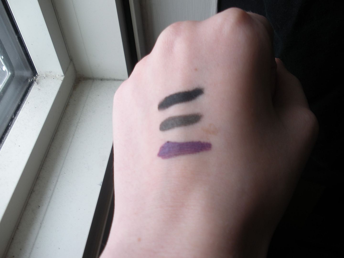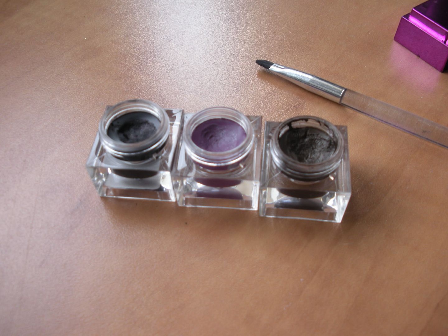 The colors you get are very pretty. You get a metallic medium taupe brown, a soft black with fine fuchsia glitter, and a medium purple with fine silver glitter. The glitter in this product is not chunky or gritty. It’s a very very fine glitter which makes the liners look a bit ‘shimmery’. the fuchsia in the black is hardly noticeable on the eye unless you look very closely.